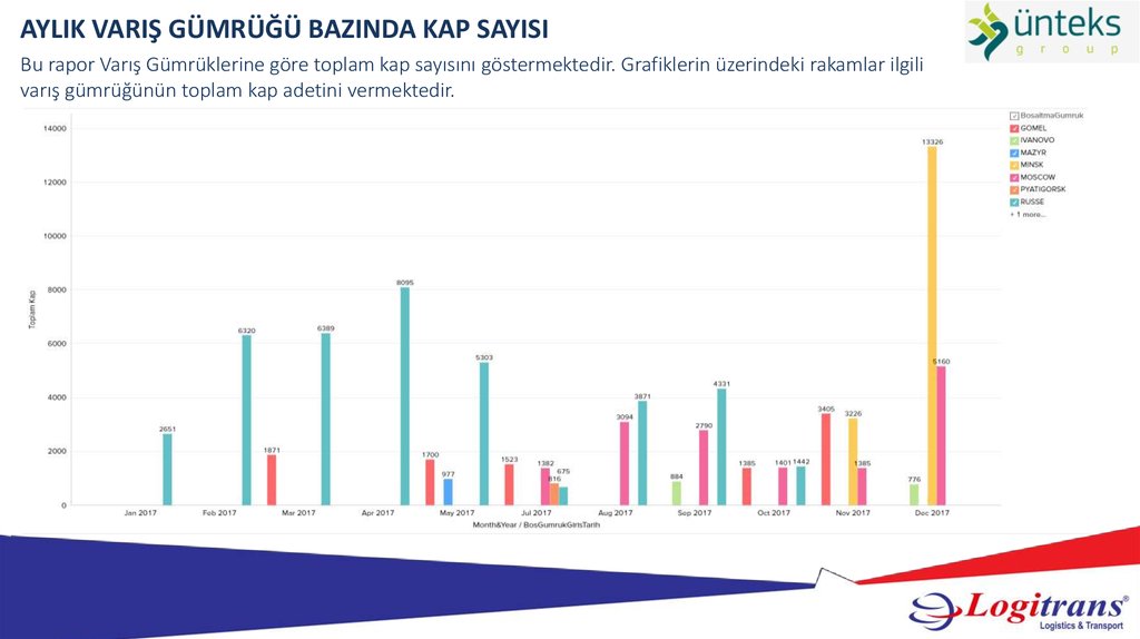 AYLIK VARIŞ GÜMRÜĞÜ BAZINDA KAP SAYISIBu rapor Varış Gümrüklerine göre toplam kap sayısını göstermektedir. Grafiklerin üzerindeki rakamlar ilgili