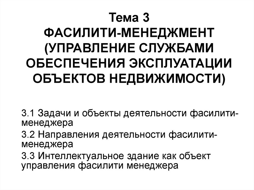 1. Тема 3 ФАСИЛИТИ-МЕНЕДЖМЕНТ (УПРАВЛЕНИЕ СЛУЖБАМИ ОБЕСПЕЧЕНИЯ ЭКСПЛУАТАЦИИ ОБЪЕКТОВ НЕДВИЖИМОСТИ)