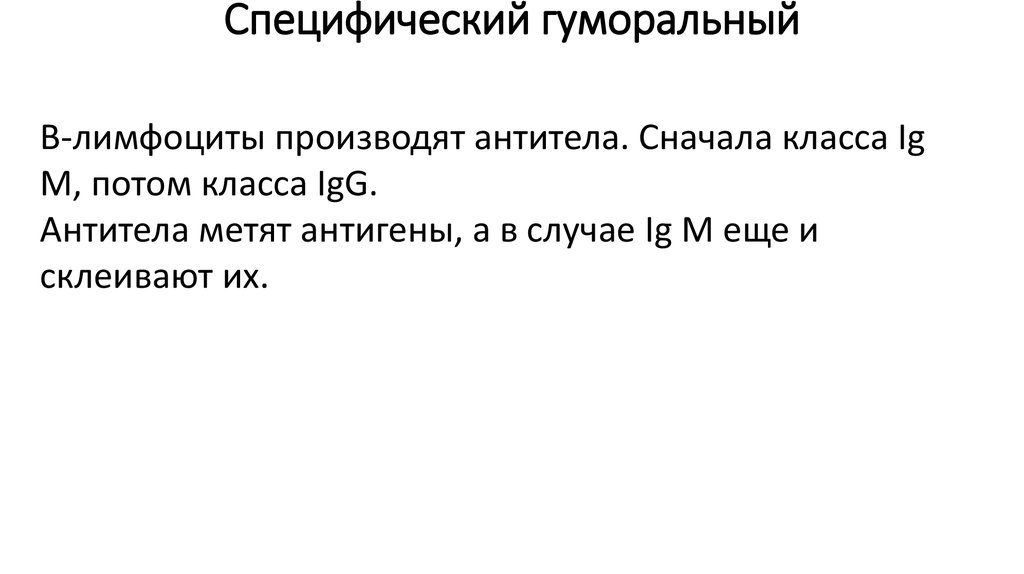 Специфический гуморальныйВ-лимфоциты производят антитела. Сначала класса Ig
