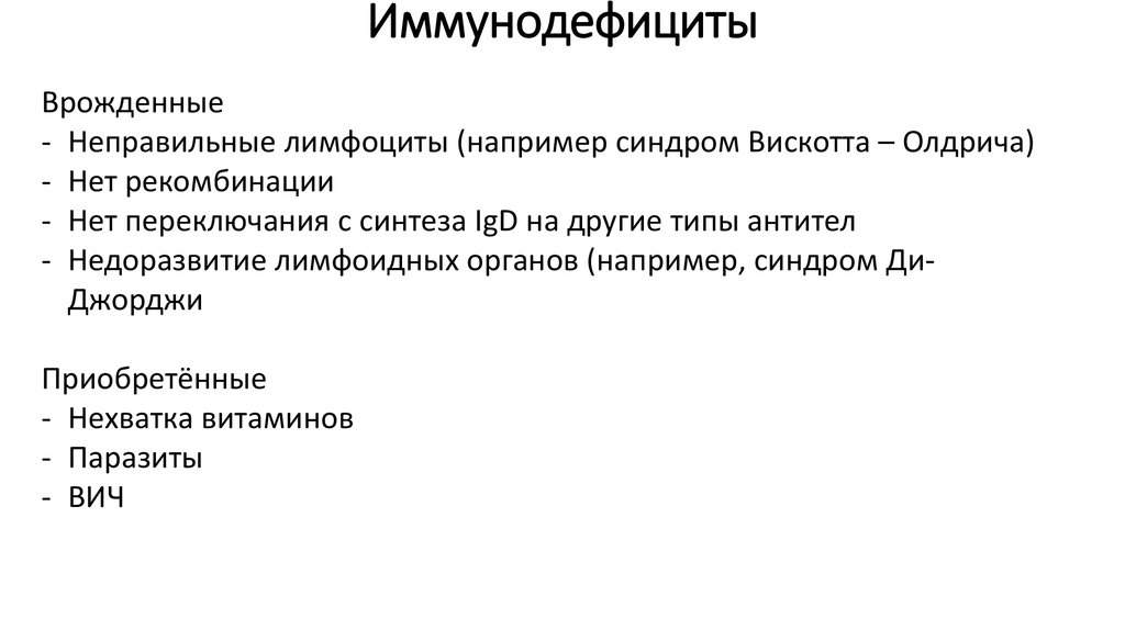 - Недоразвитие лимфоидных органов (например, синдром ДиДжорджи