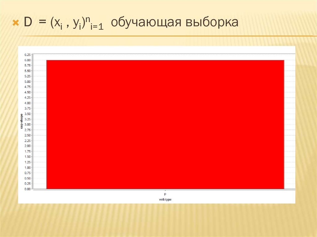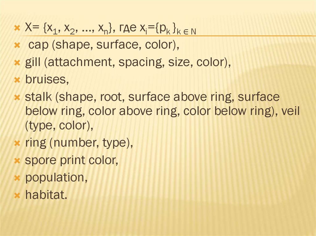 X= {x1, x2, …, xn}, где xi={pk }k ∈ Ncap (shape, surface, color),