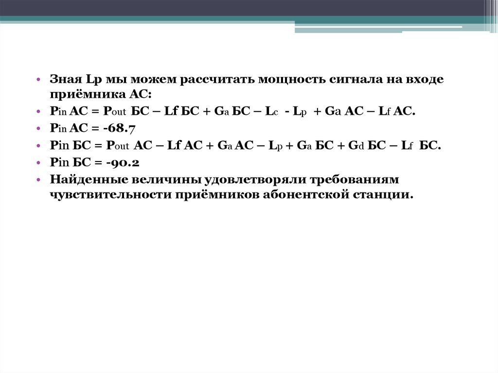 • Pin БС = Pout АС – Lf АС + Ga АС – Lp + Gа БС + Gd БС – Lf БС.
