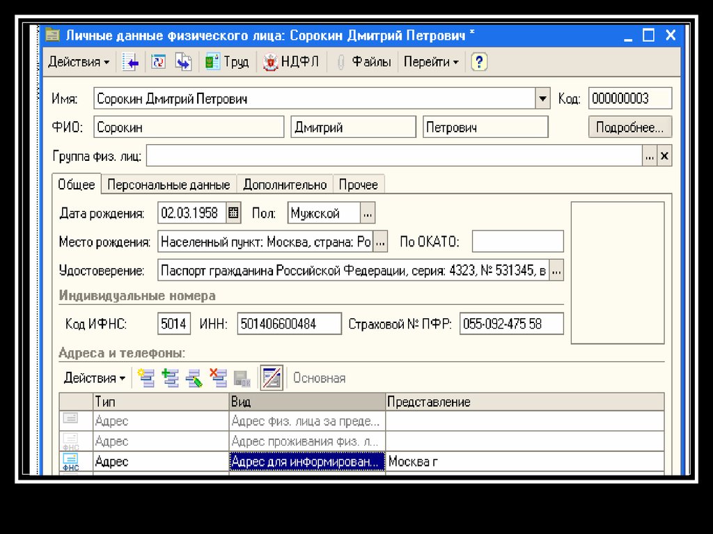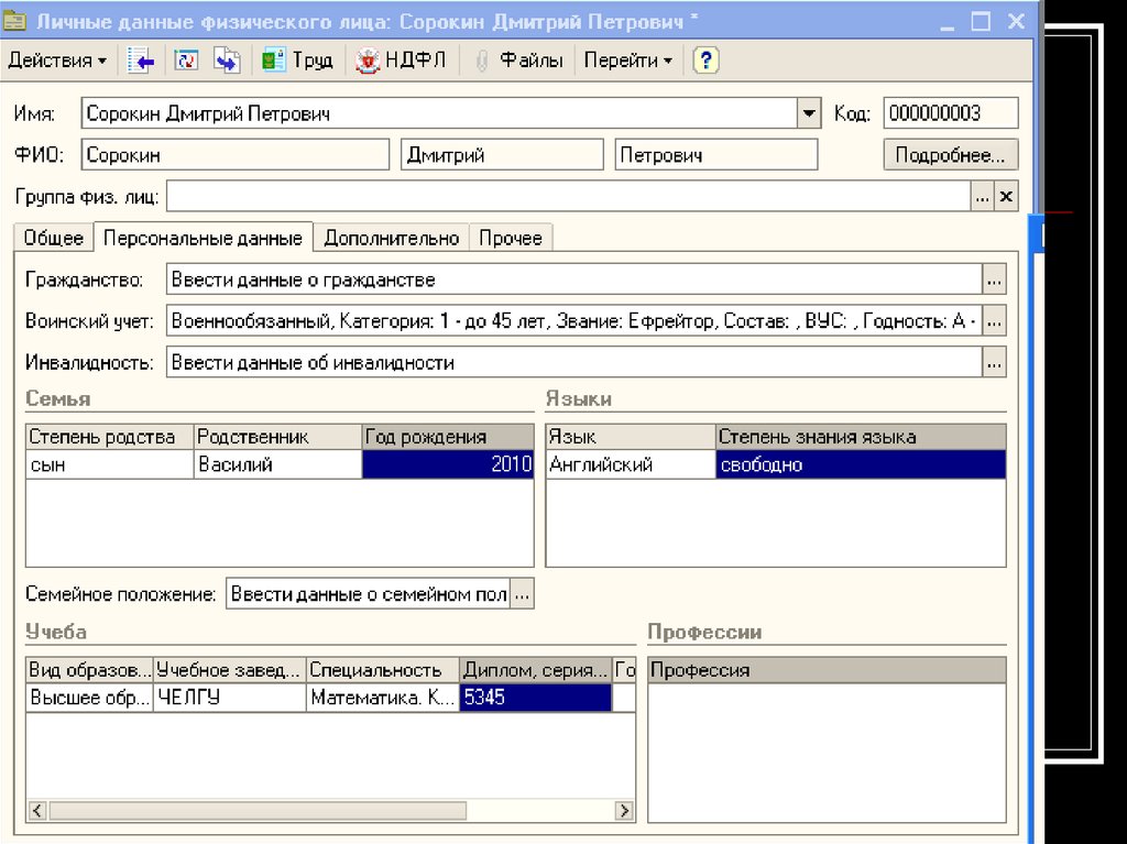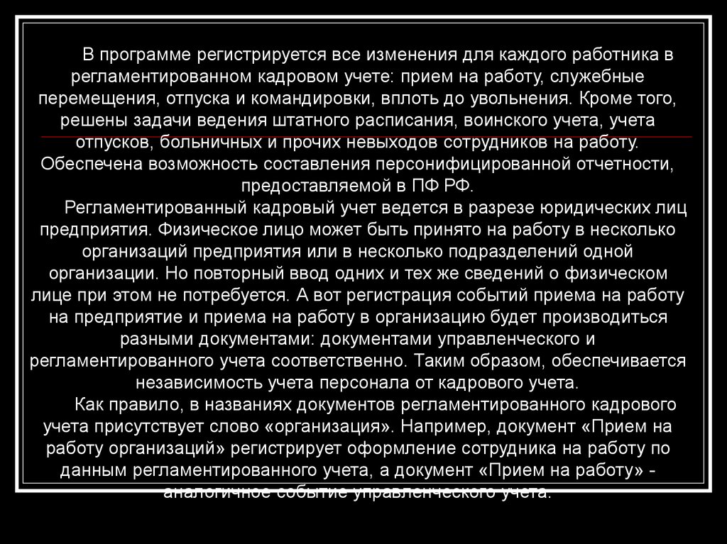 В программе регистрируется все изменения для каждого работника врегламентированном кадровом учете: прием на работу, служебные