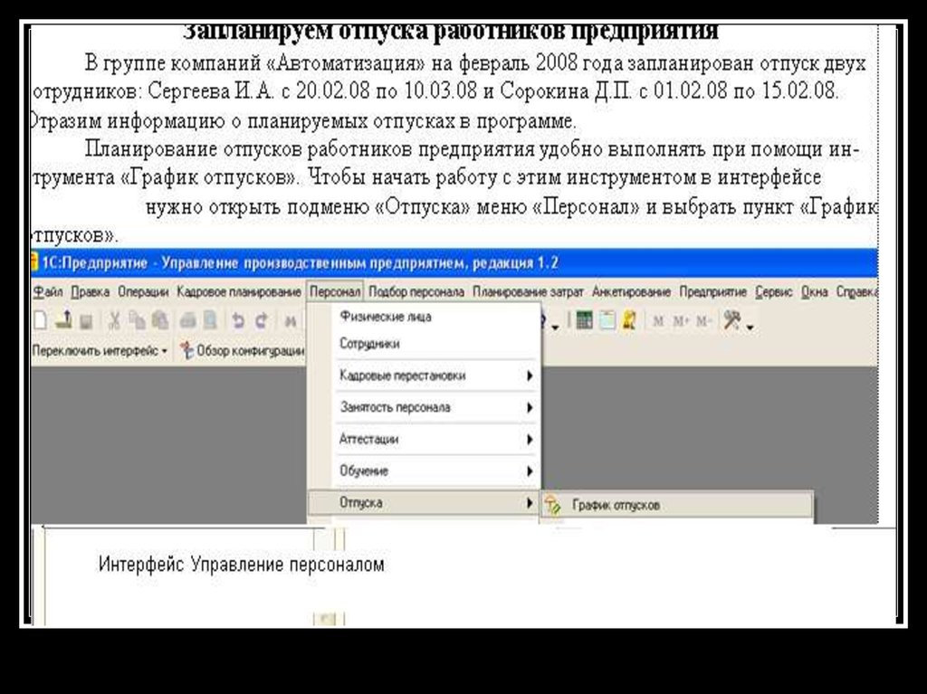 «Отпуска» меню «Персонал» в интерфейсе «Управление персоналом».52. Печатная форма графика отпусков (Т-7)