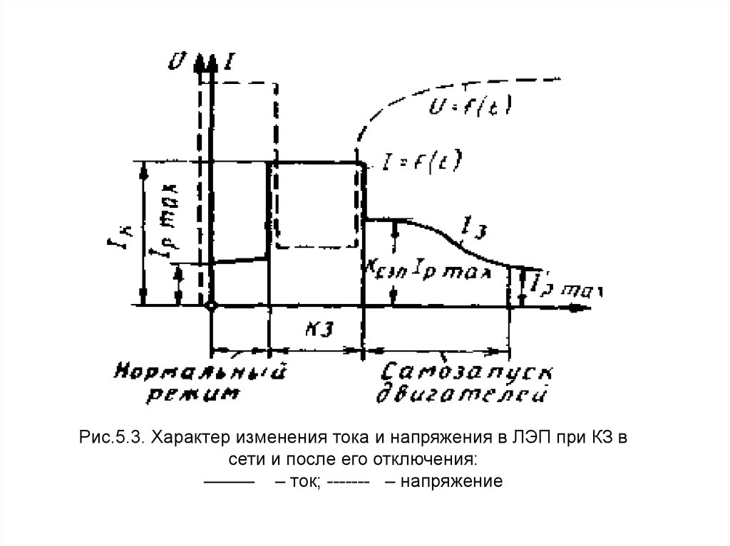 Рис.5.3. Характер изменения тока и напряжения в ЛЭП при КЗ всети и после его отключения: