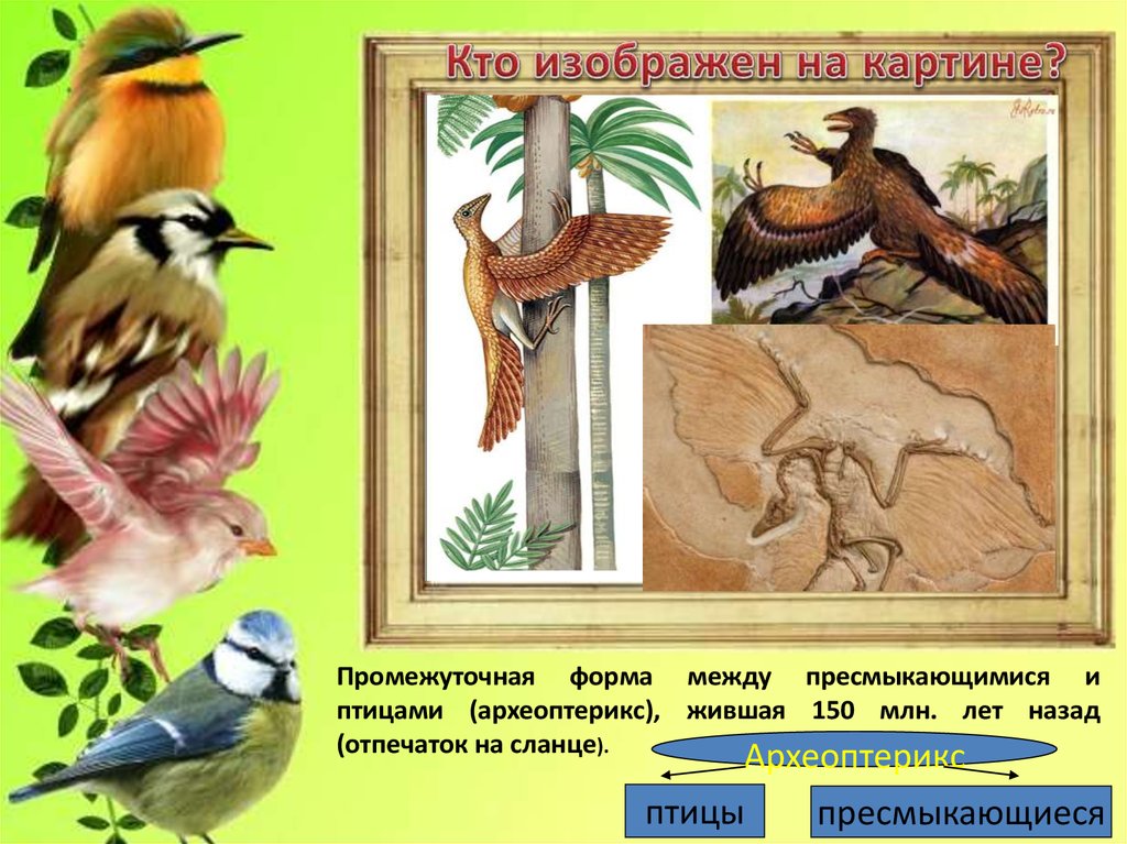 Промежуточная форма между пресмыкающимися иптицами (археоптерикс), жившая 150 млн. лет назад