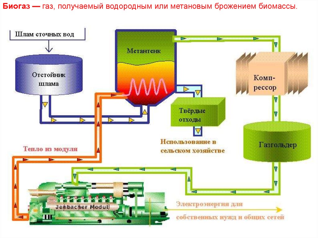 Биогаз — газ, получаемый водородным или метановым брожением биомассы.6.