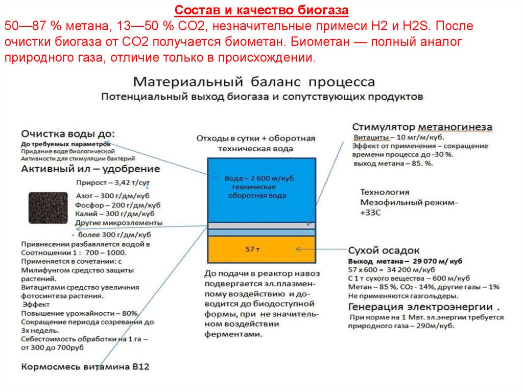 Состав и качество биогаза50—87 % метана, 13—50 % CO2, незначительные примеси H2 и H2S. После