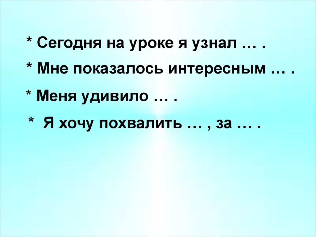 * Сегодня на уроке я узнал … .* Мне показалось интересным … .