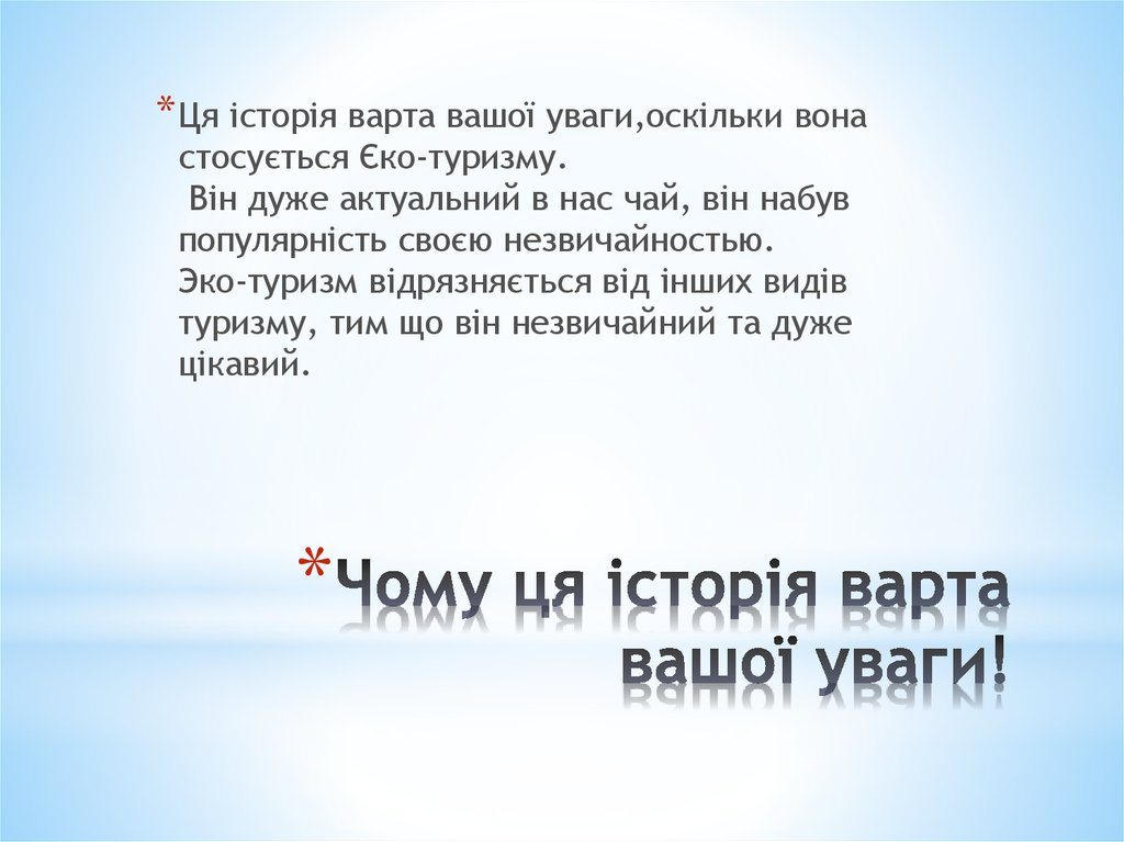 * Ця історія варта вашої уваги,оскільки вонастосується Єко-туризму.
