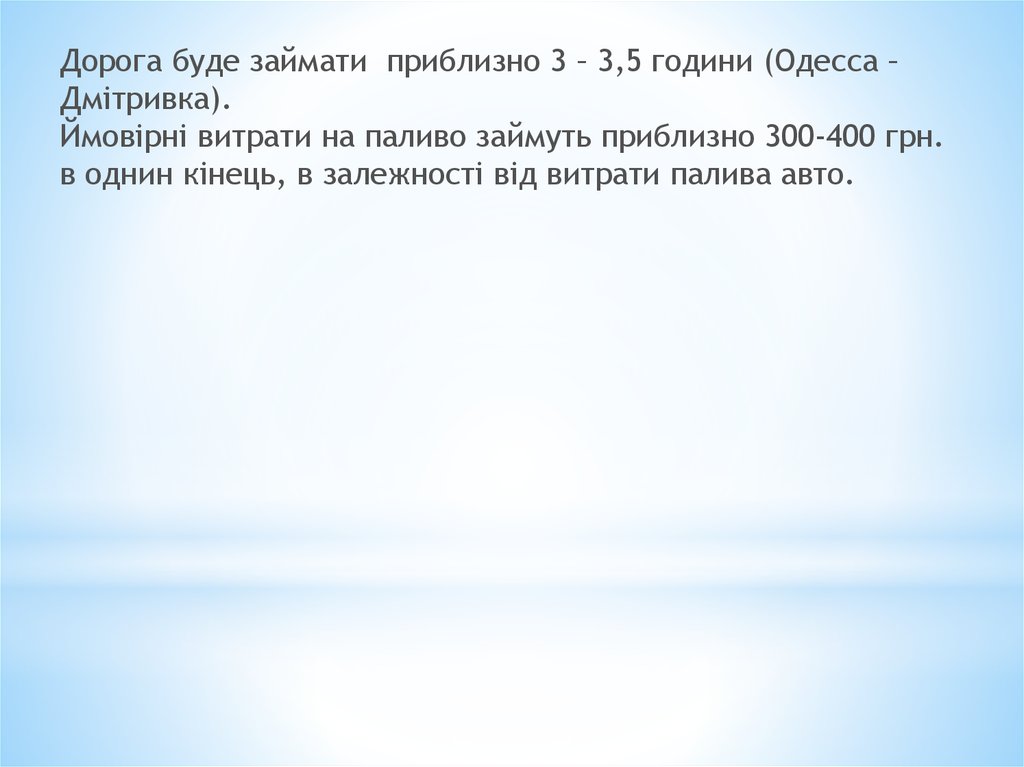 Дорога буде займати приблизно 3 – 3,5 години (Одесса –Дмітривка).