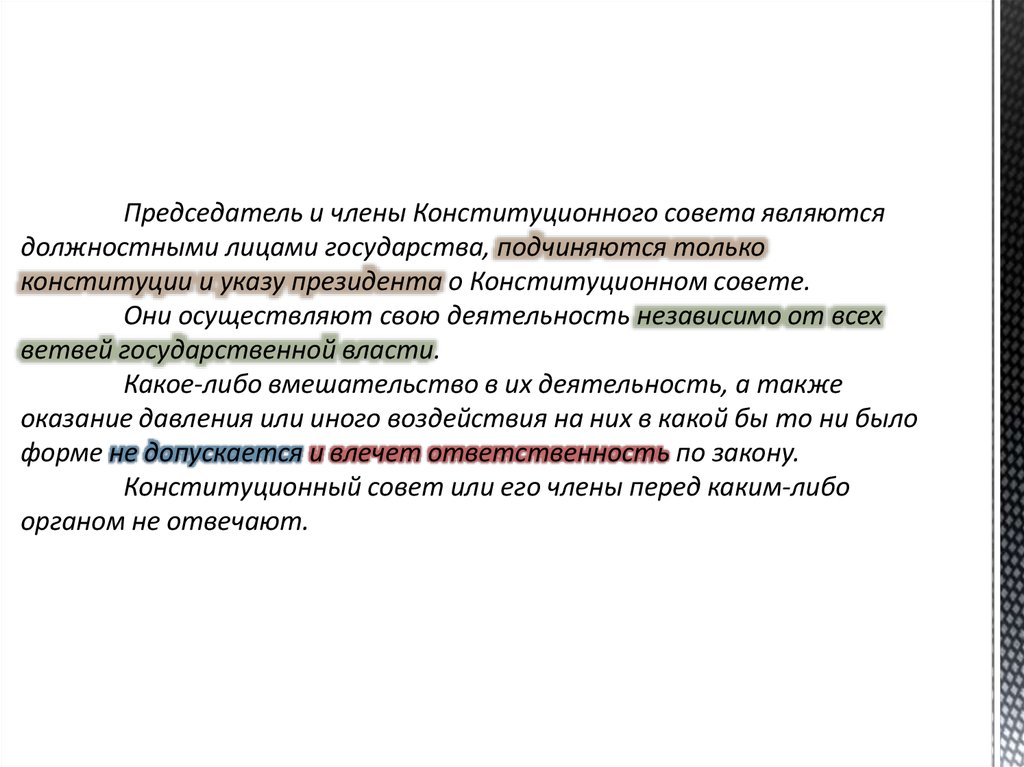 Председатель и члены Конституционного совета являютсядолжностными лицами государства, подчиняются только
