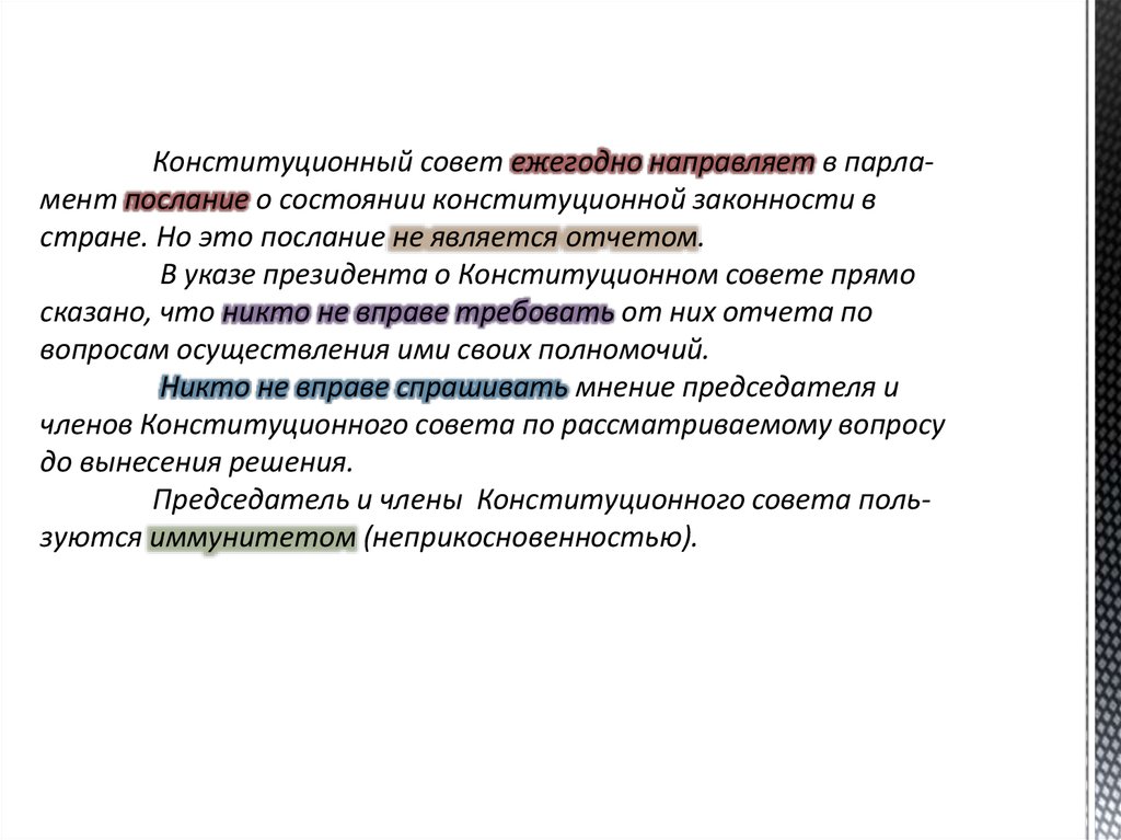 Конституционный совет ежегодно направляет в парламент послание о состоянии конституционной законности встране. Но это послание не является отчетом.