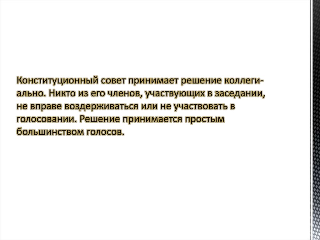 Конституционный совет принимает решение коллегиально. Никто из его членов, участвующих в заседании,не вправе воздерживаться или не участвовать в