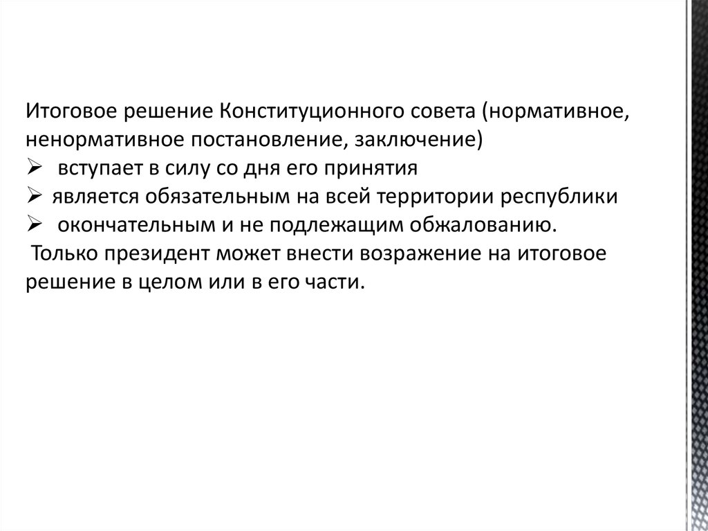 Итоговое решение Конституционного совета (нормативное,ненормативное постановление, заключение)