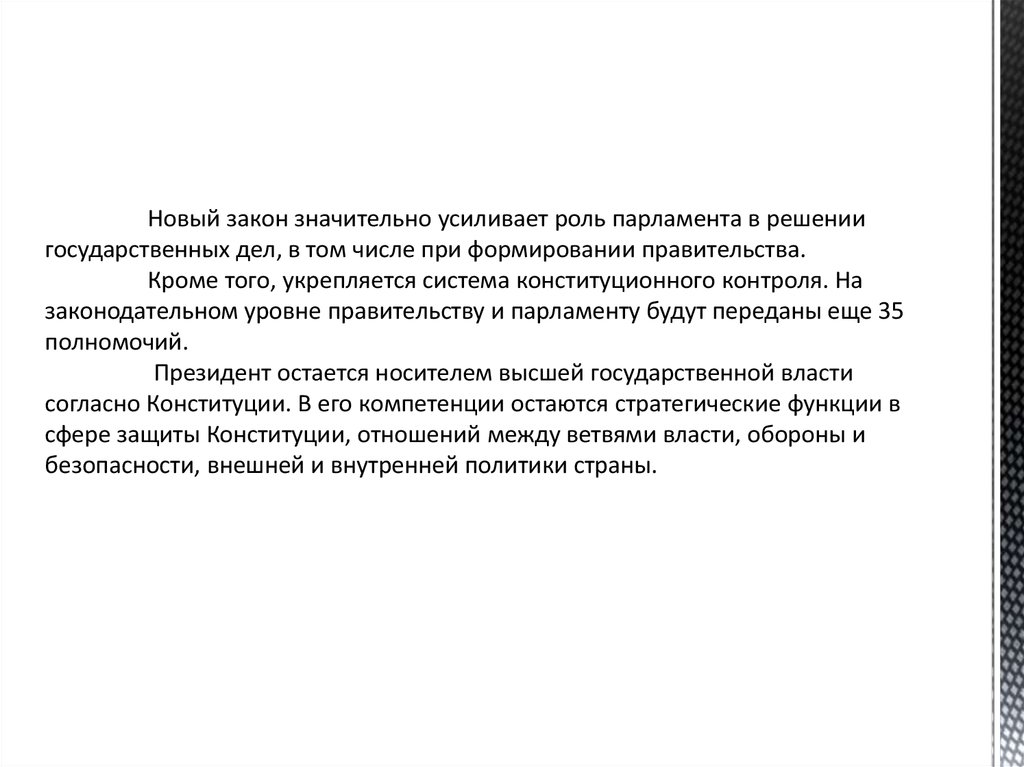 Новый закон значительно усиливает роль парламента в решениигосударственных дел, в том числе при формировании правительства.