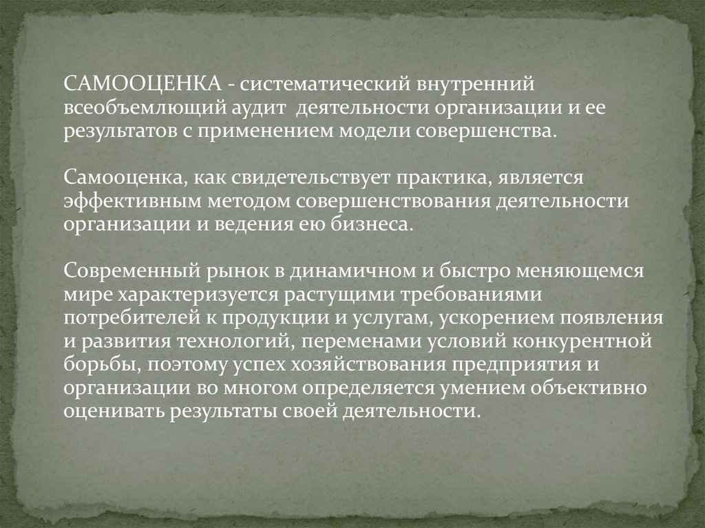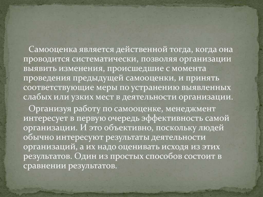 Самооценка является действенной тогда, когда онапроводится систематически, позволяя организации