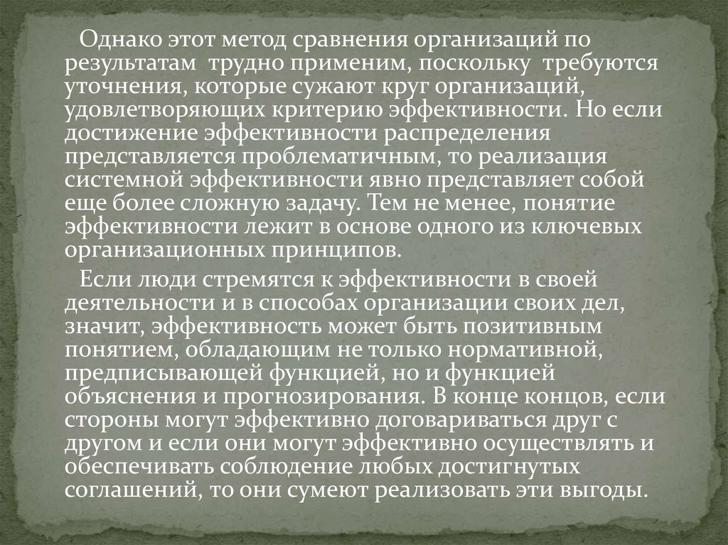 Однако этот метод сравнения организаций порезультатам трудно применим, поскольку требуются