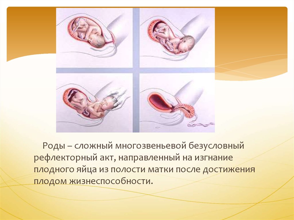 Роды – сложный многозвеньевой безусловныйрефлекторный акт, направленный на изгнание