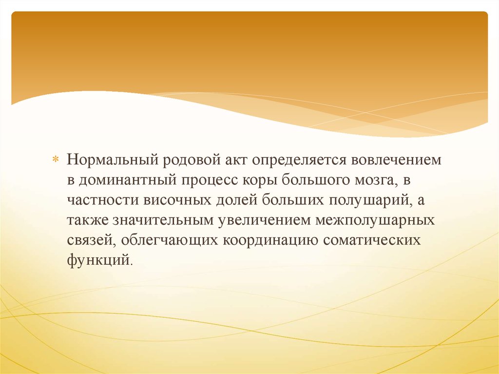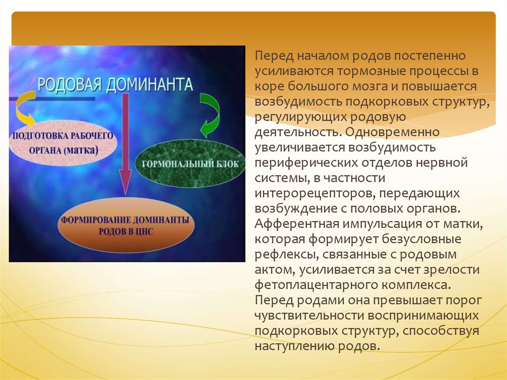Нормальный родовой акт определяется вовлечениемв доминантный процесс коры большого мозга, в