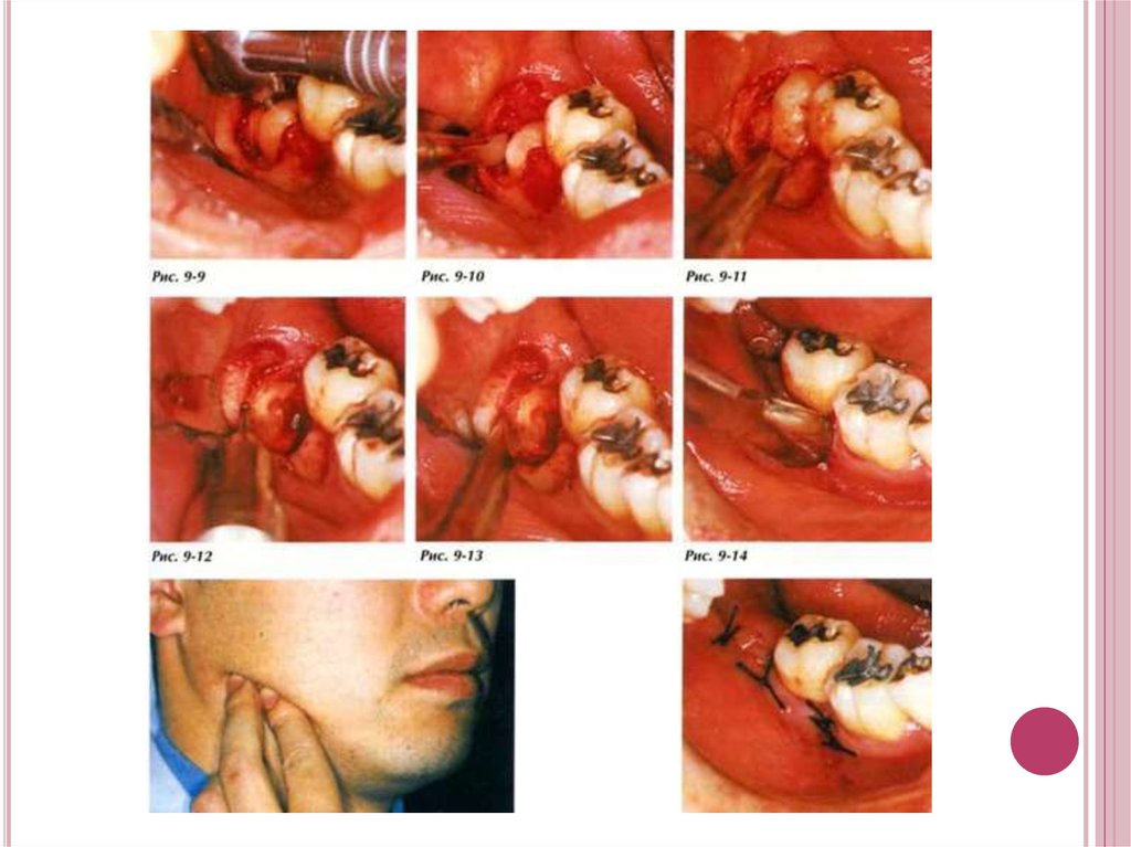С дистальной и медиально-щечной сторон зуба4.7 провели разрезы, откинулм слизистонадкостничный лоскут и обнажили