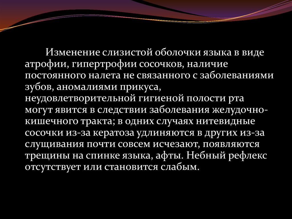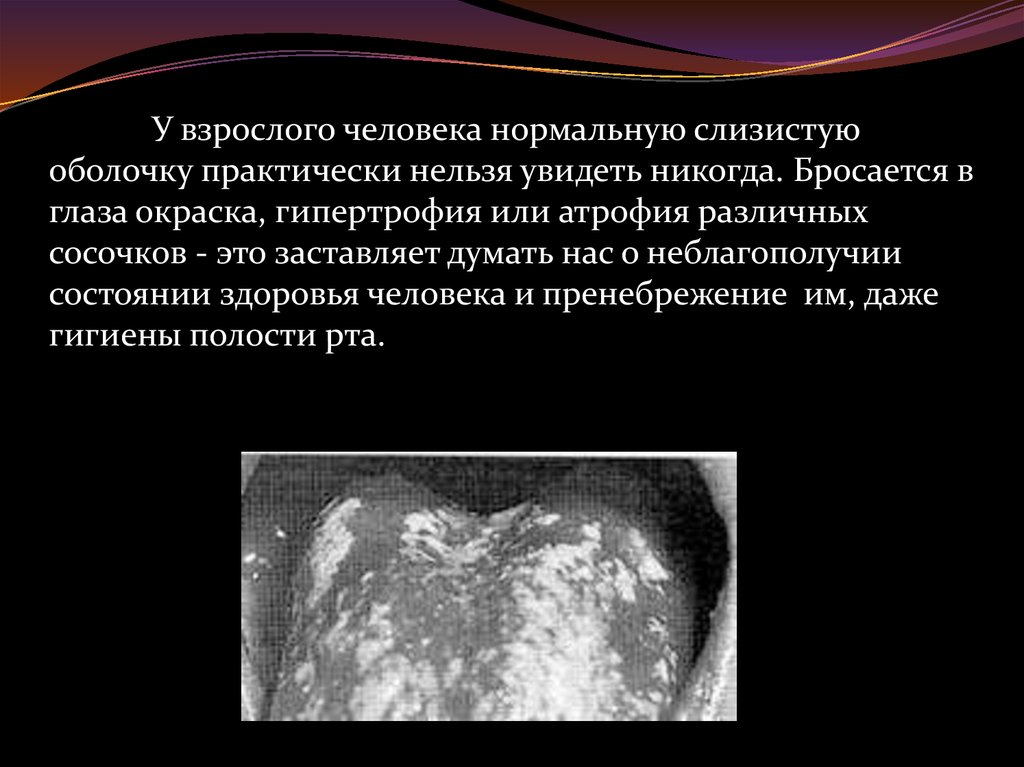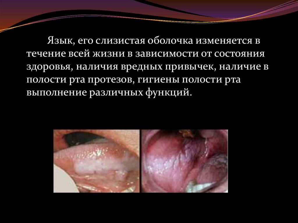 Язык, его слизистая оболочка изменяется втечение всей жизни в зависимости от состояния