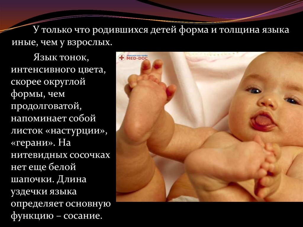 У только что родившихся детей форма и толщина языкаиные, чем у взрослых.