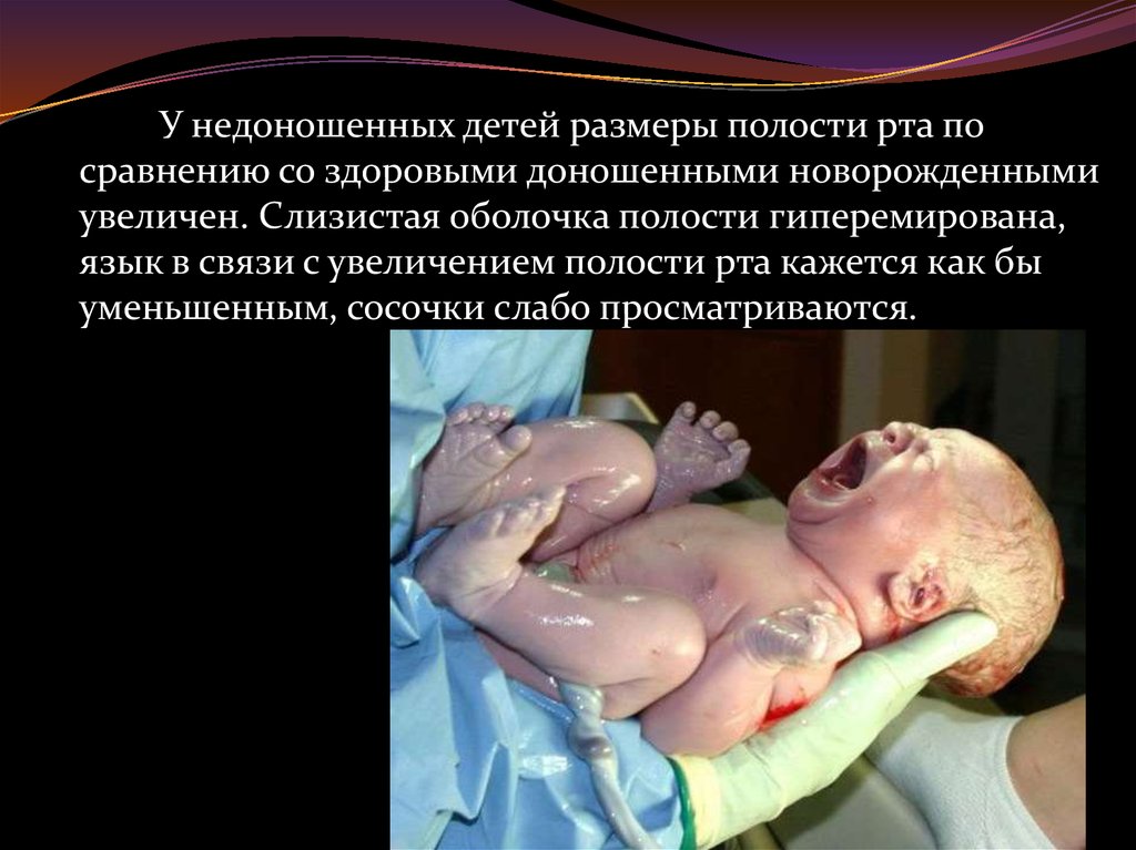 У недоношенных детей размеры полости рта посравнению со здоровыми доношенными новорожденными