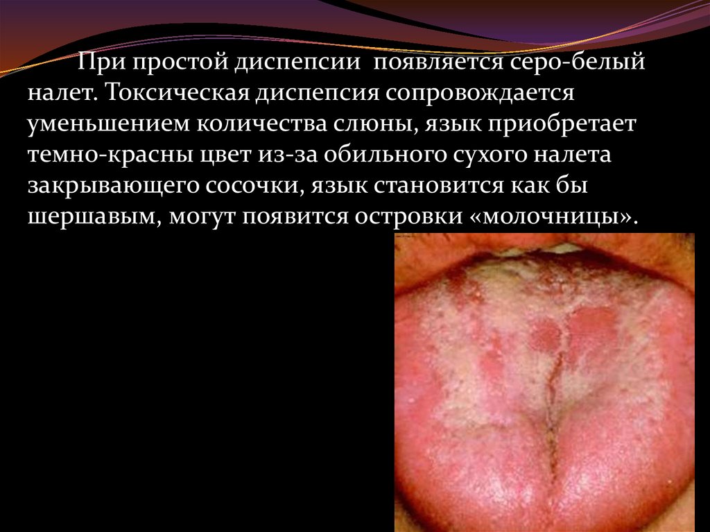 При простой диспепсии появляется серо-белыйналет. Токсическая диспепсия сопровождается
