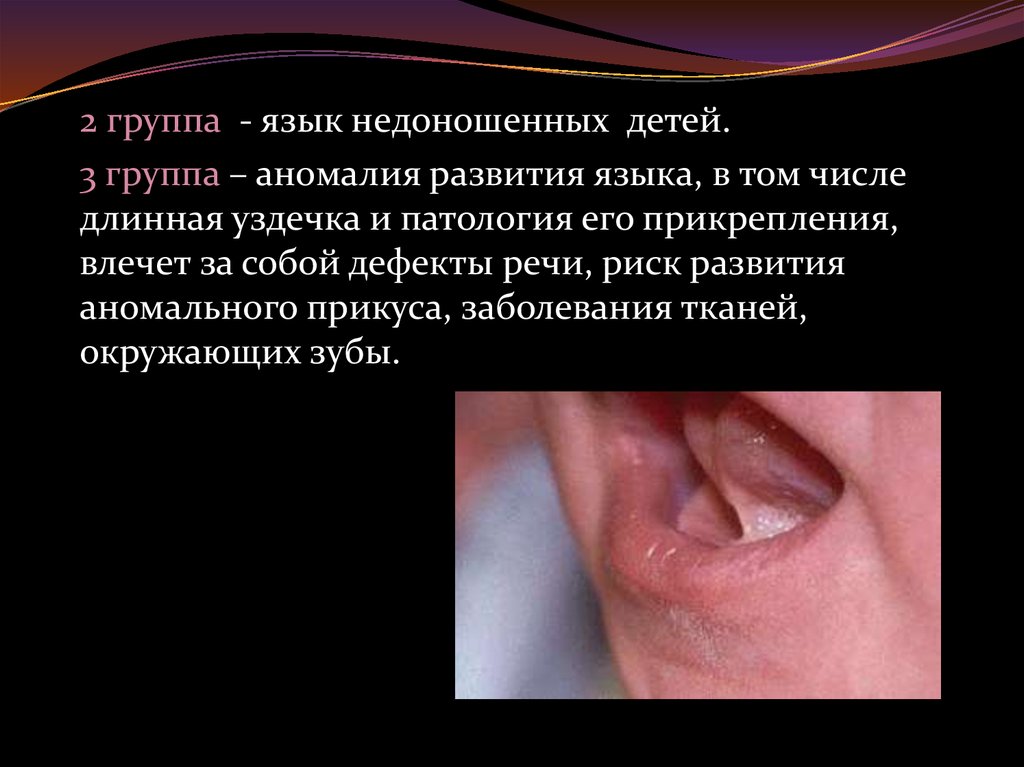 2 группа - язык недоношенных детей.3 группа – аномалия развития языка, в том числе