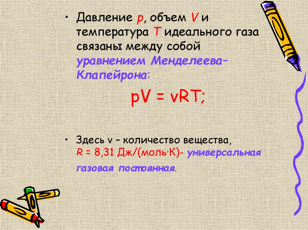 • Давление p, объем V итемпература T идеального газа