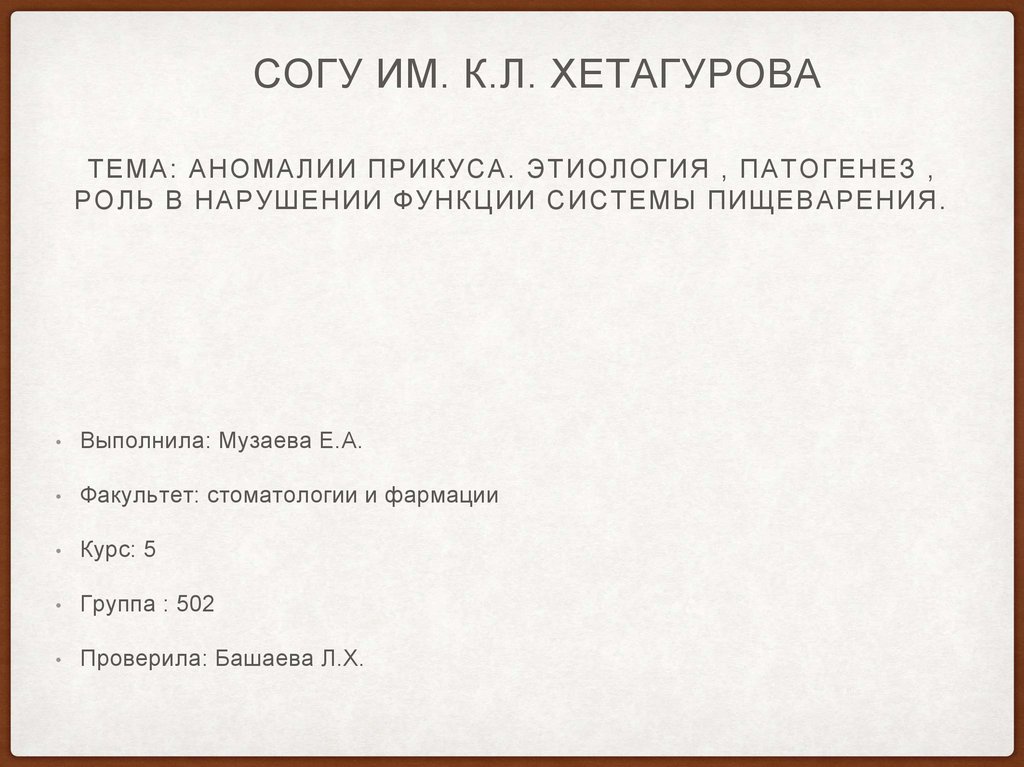 СОГУ ИМ. К.Л. ХЕТАГУРОВАТЕМА: АНОМАЛИИ ПРИКУСА. ЭТИОЛОГИЯ , ПАТОГЕНЕЗ ,