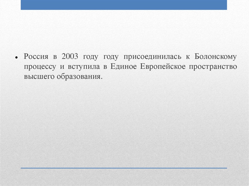 Россия в 2003 году году присоединилась к Болонскомупроцессу и вступила в Единое Европейское пространство