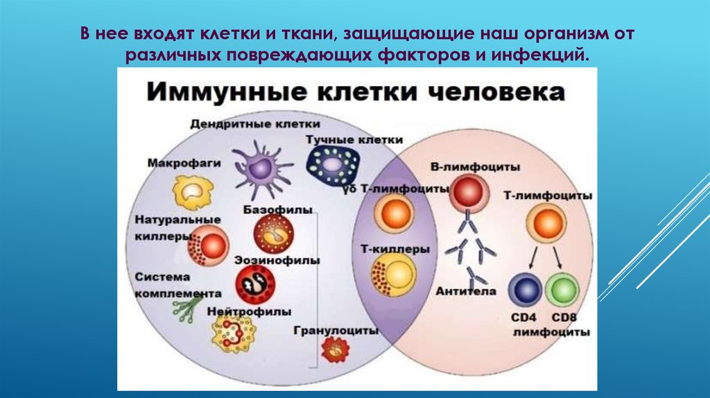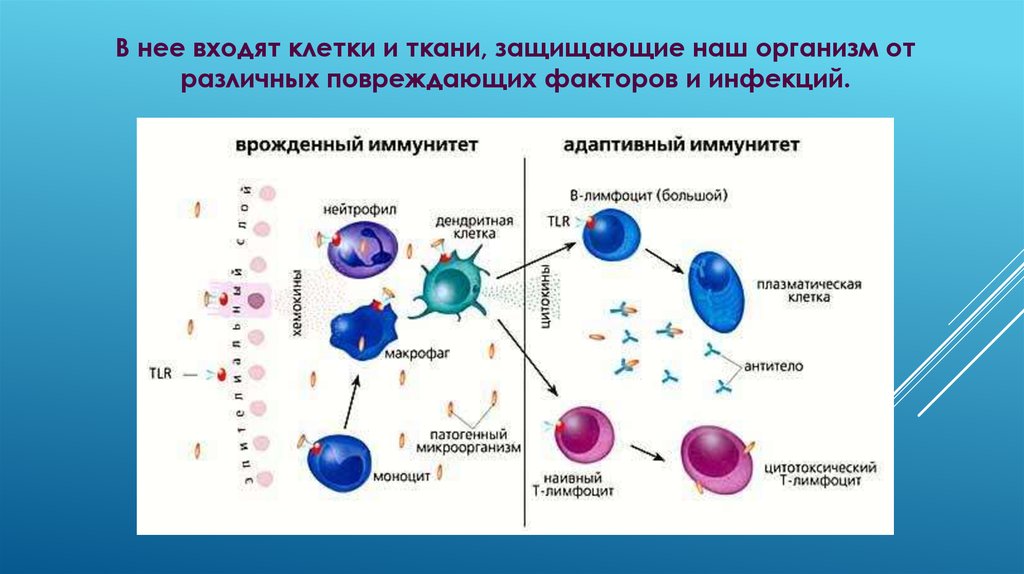 В нее входят клетки и ткани, защищающие наш организм отразличных повреждающих факторов и инфекций.