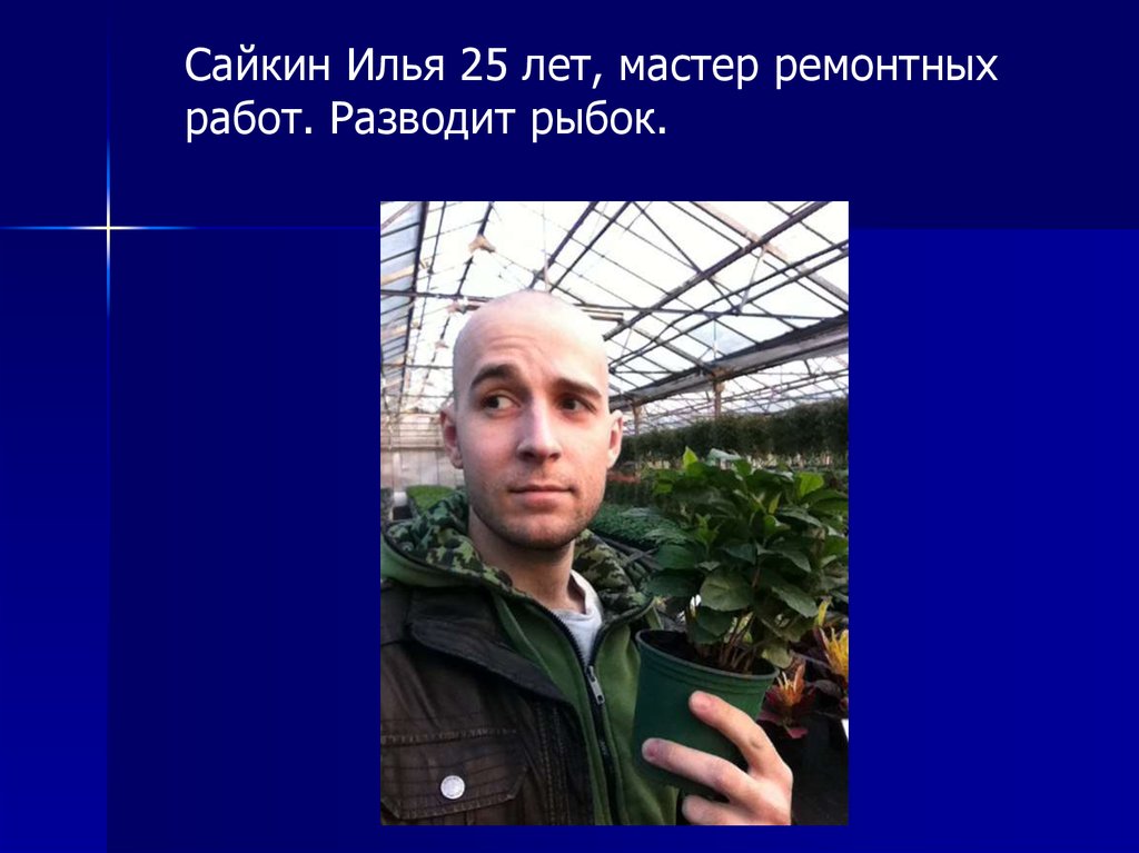 Сайкин Илья 25 лет, мастер ремонтныхработ. Разводит рыбок.