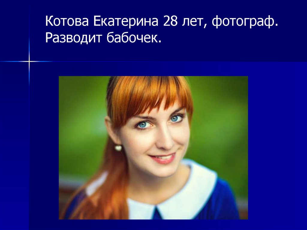Котова Екатерина 28 лет, фотограф.Разводит бабочек.