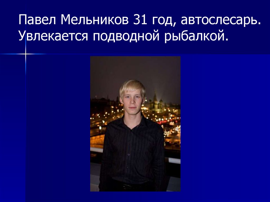 Павел Мельников 31 год, автослесарь.Увлекается подводной рыбалкой.