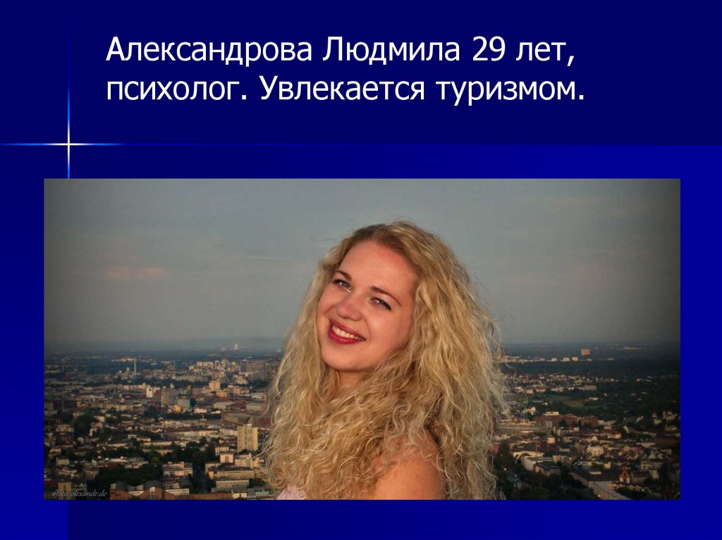 Александрова Людмила 29 лет,психолог. Увлекается туризмом.