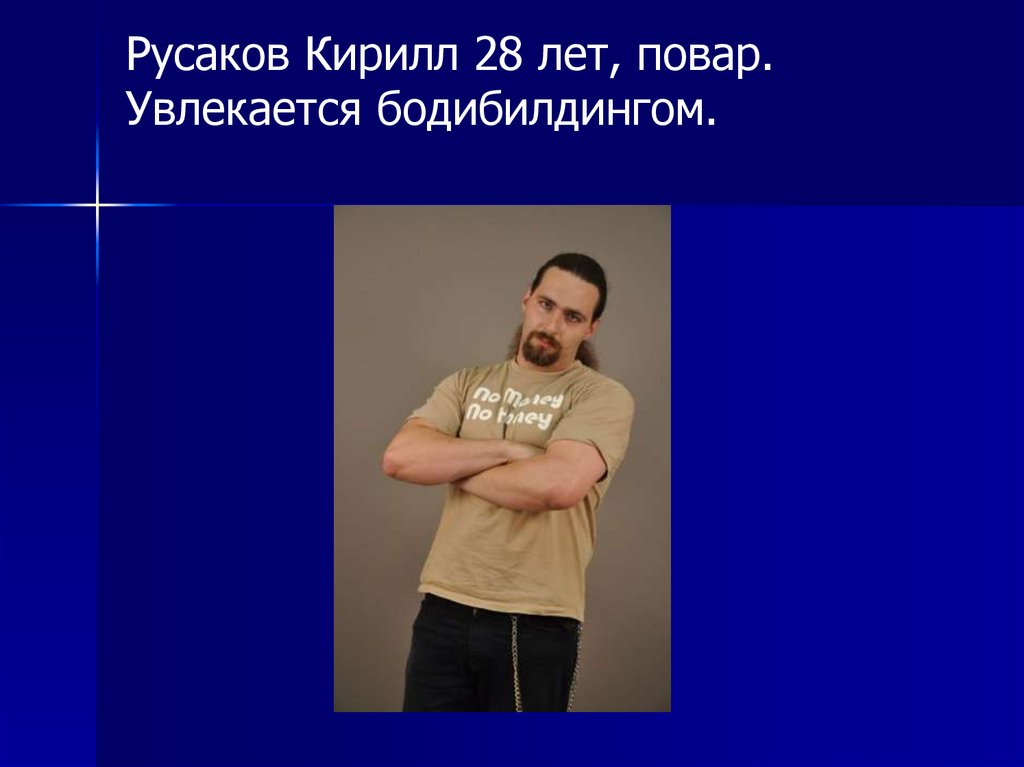 Русаков Кирилл 28 лет, повар.Увлекается бодибилдингом.