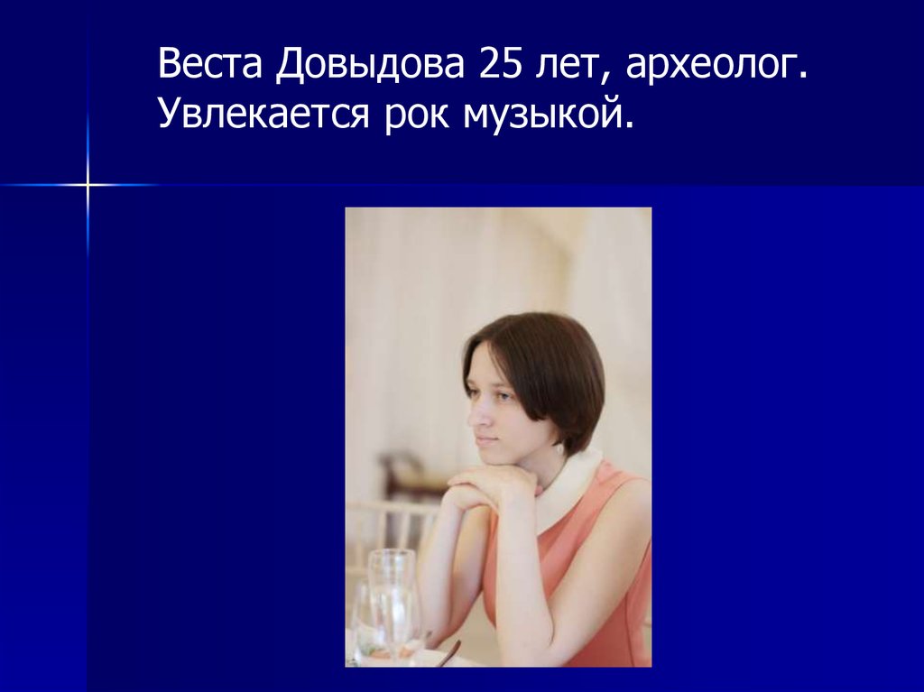 Веста Довыдова 25 лет, археолог.Увлекается рок музыкой.