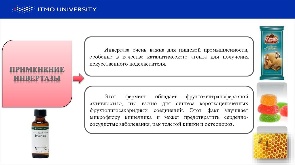 Инвертаза очень важна для пищевой промышленности,особенно в качестве каталитического агента для получения