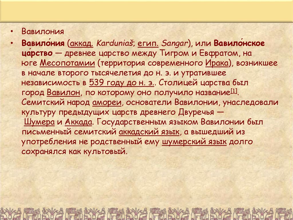 • Вавилония• Вавило́ния (аккад. Karduniaš; егип. Sangar), или Вавило́нское