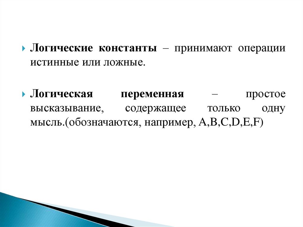 Логические константы – принимают операцииистинные или ложные.