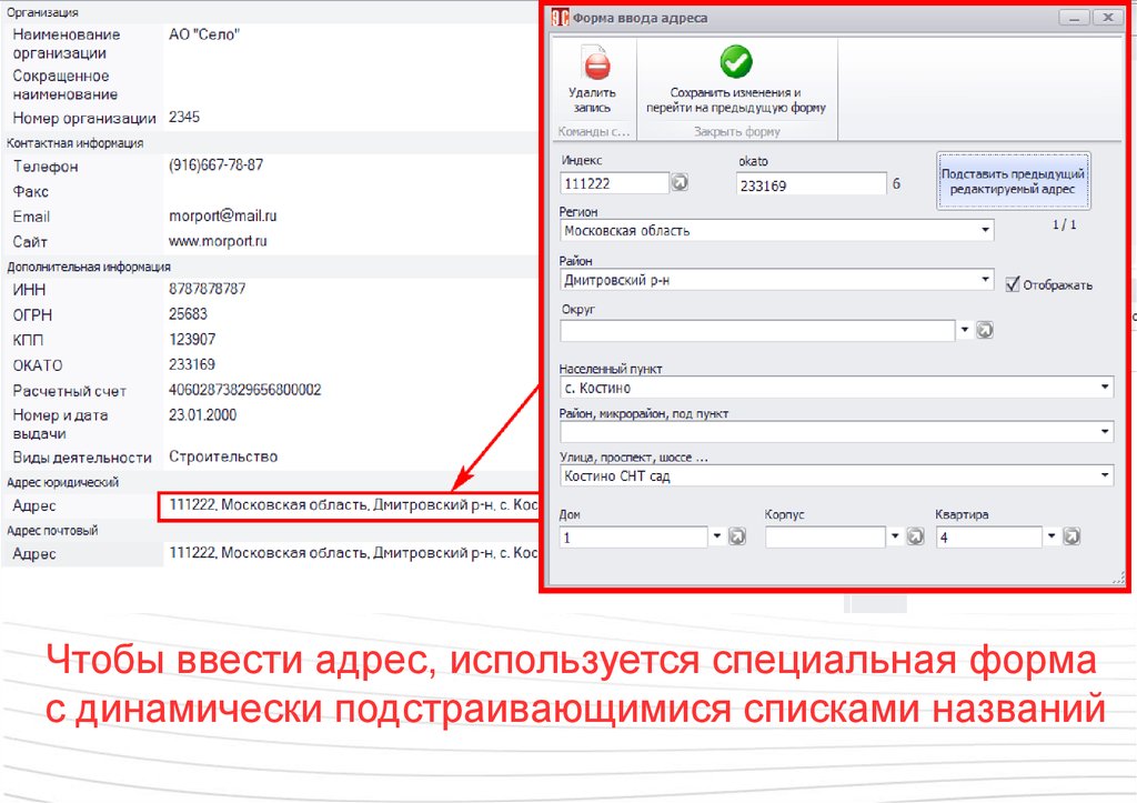 Чтобы ввести адрес, используется специальная формас динамически подстраивающимися списками названий