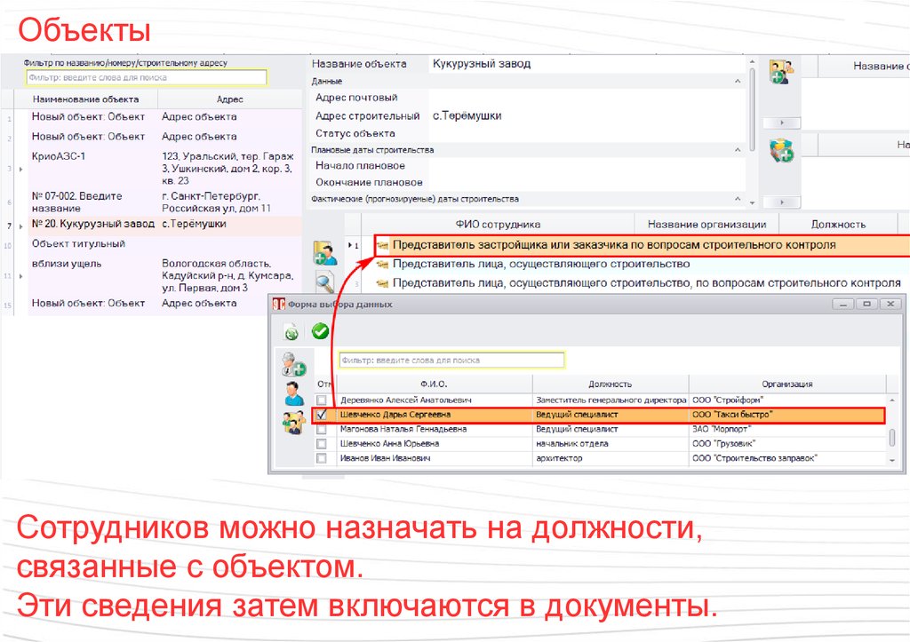 ОбъектыСотрудников можно назначать на должности,