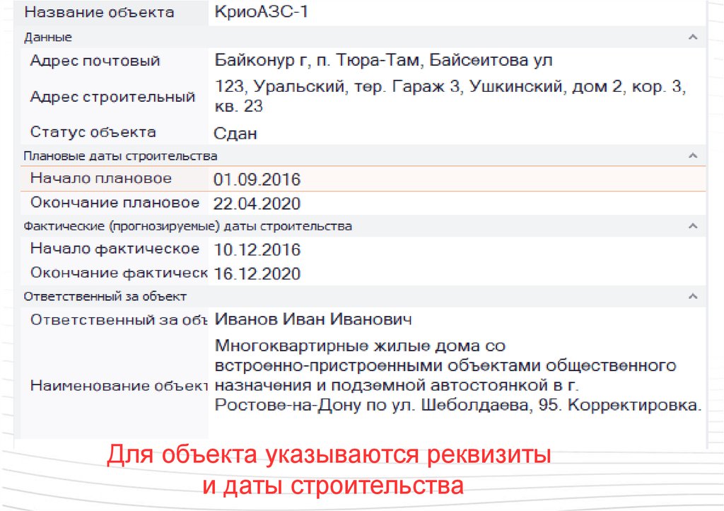 Для объекта указываются реквизитыи даты строительства