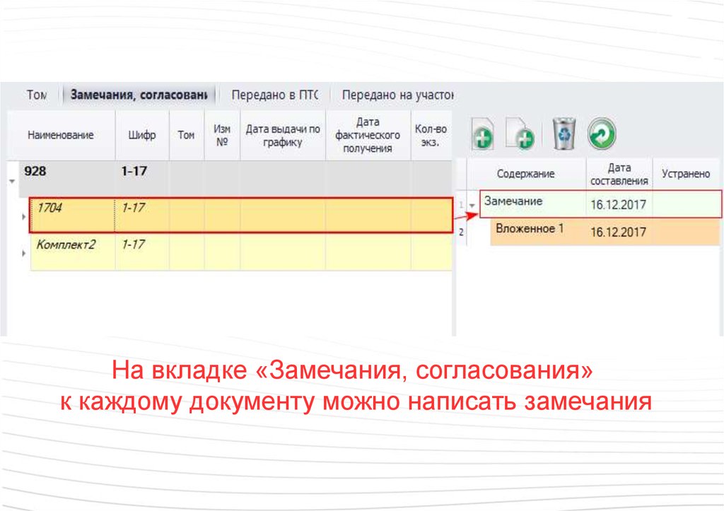 На вкладке «Замечания, согласования»к каждому документу можно написать замечания
