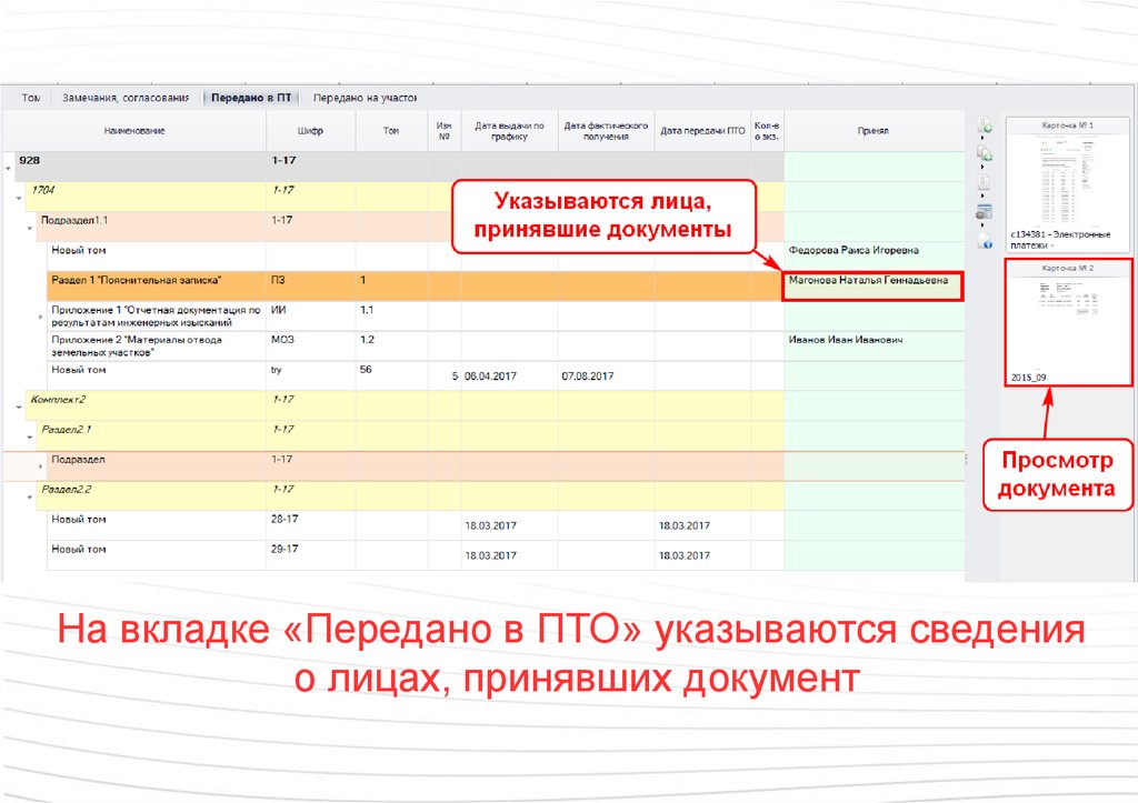 На вкладке «Передано в ПТО» указываются сведенияо лицах, принявших документ