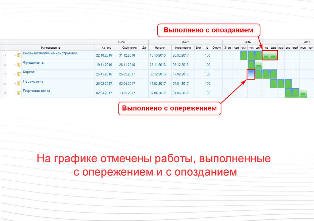 На графике отмечены работы, выполненныес опережением и с опозданием