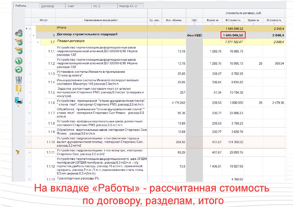 На вкладке «Работы» - рассчитанная стоимостьпо договору, разделам, итого